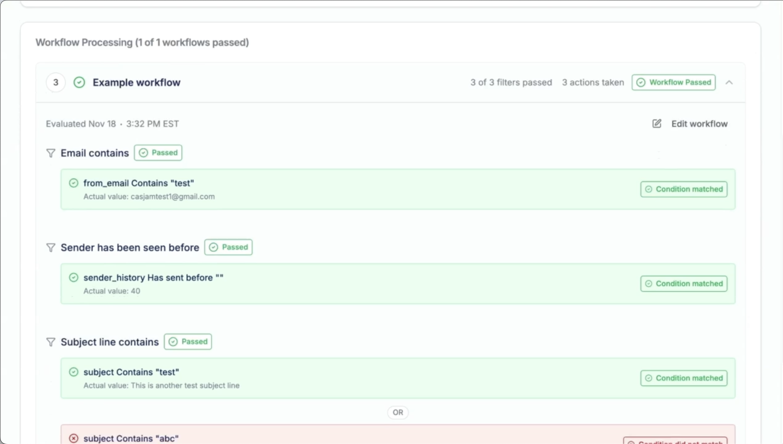 FilterHawk shows you an audit trail for every single email. See exactly which filters passed or failed and which actions were taken. Use these insights to dial in your filtering perfectly.