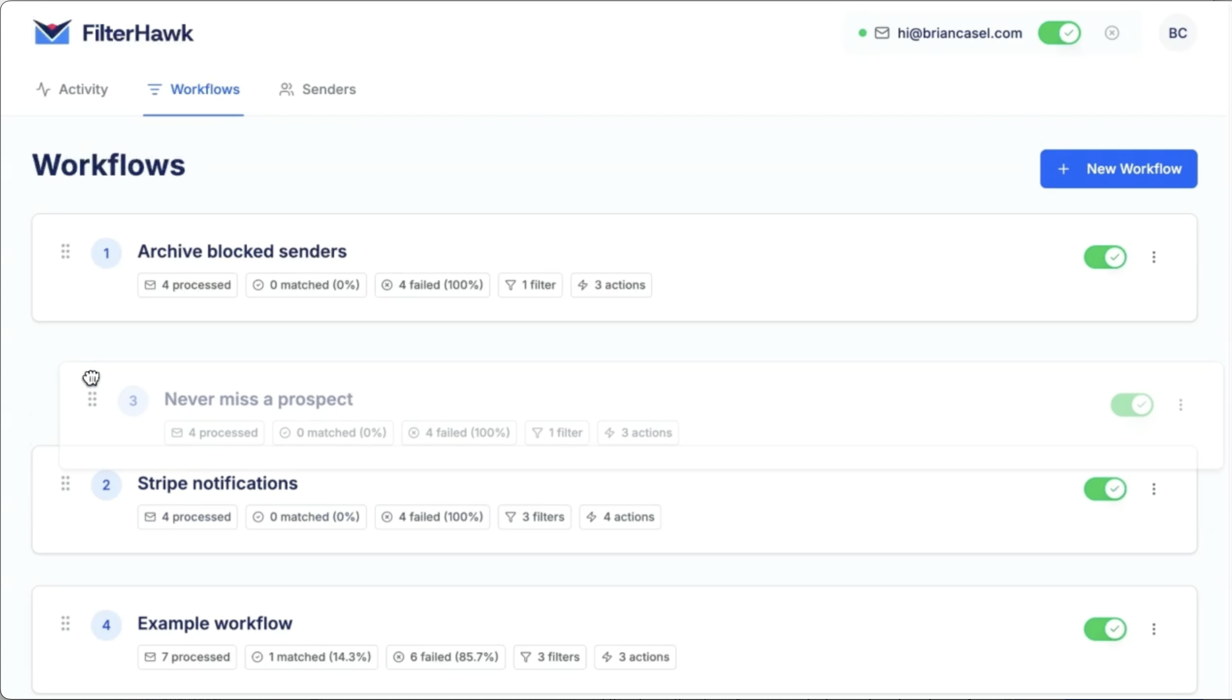 FilterHawk follows your priority order, always. Drag and drop to reorder. Perfectly predictable.